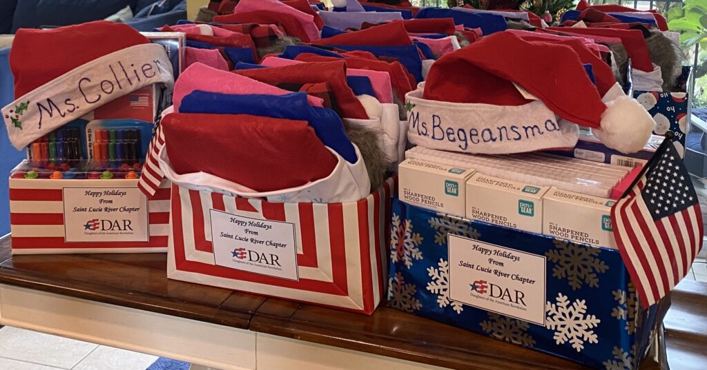 Constitution Week Flag Day Creating a Buzz through Community Service Making homemade Dolls and donating them to the Children's Hospital Collecting Donations for Homeless Veterans Adopting a Community Classroom Project Our 2023-2024 Windmill Point Elementary School Community Classroom Principal and First Grade Teacher Donating to Veteran Families for Christmas Decorating the Ardie R. Copas State Nursing Home for the Holidays Ian T. Zook Park Clean Up 2022 Saint Lucie River High School Scholarship Winners DAR.org